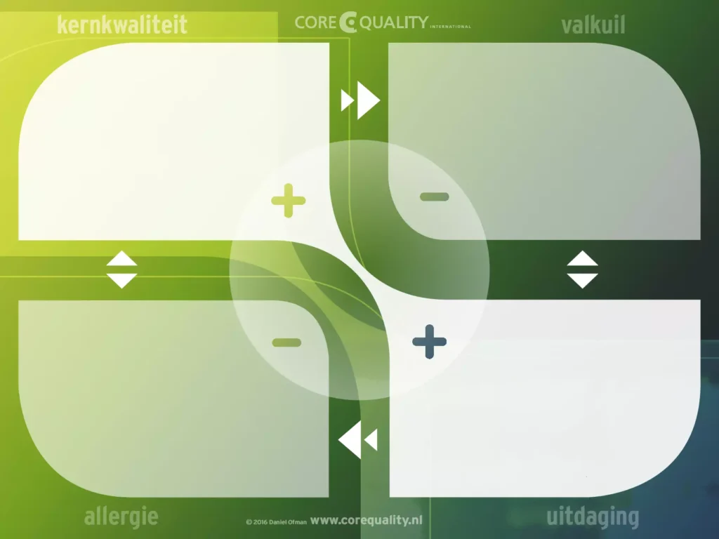 Je zult erachter komen, zeker als je deze oefening met anderen samen doet, dat wat voor de èèn een uitdaging is, voor de ander een allergie kan zijn, een kernkwaliteit of juist valkuil. Dit soort kwadranten zijn altijd strikt individueel. Het gaat er vooral om jouw eigen beeld helder te krijgen, zodat je weet waar je wat gas moet geven, of juist wat zou kunnen afremmen, en vooral ook waarom, en wat je ermee bereikt!